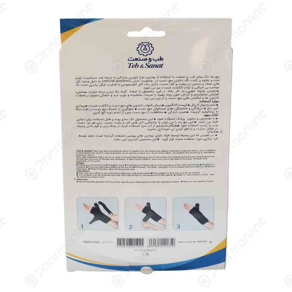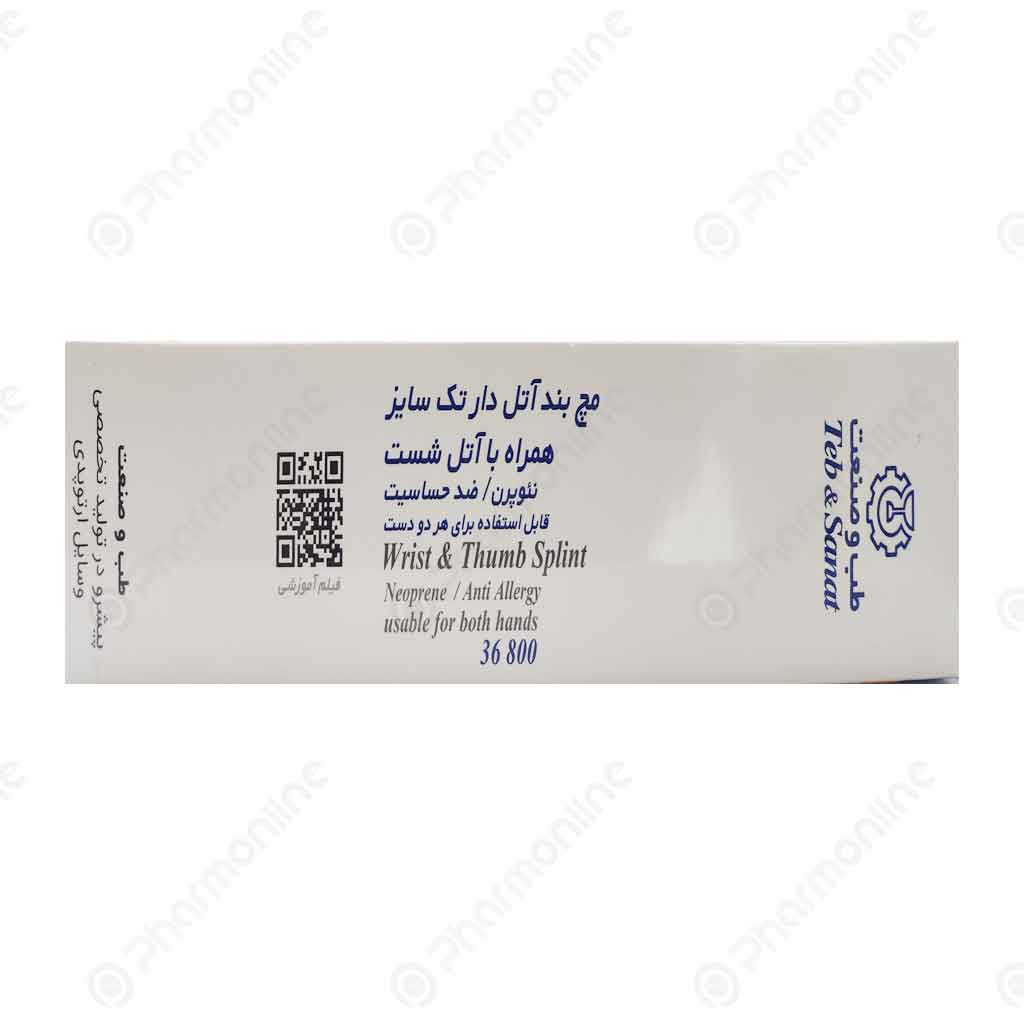 مچ بند تک سایز طب و صنعت کد ۳۶۸۰۰ با استفاده از بهترین نوع نئوپرن وارداتی با پارچه ضد حساسیت تولید شده است. علاوه بر ثابت نگه داشتن مچ دست در وضعیت خنثی (natural position) به دلیل وجود آتلهای صاف و منحنی در پشت و کف دست، دارای یک آتل آلومینیومی با قابلیت شکلپذیری است که موجب بیحرکتی و ثبات انگشت شست نیز میشود. همچنین پارچه نئوپرن به کار رفته در این محصول با ایجاد گرما، بالا بردن درجه حرارت موضعی، افزایش متابولیسم و گردش خون روند بهبود را سرعت بخشیده و تورم، درد و خشکی نسوج در عضلات، تاندونها و لیگامانهای مچ دست را از بین میبرد.