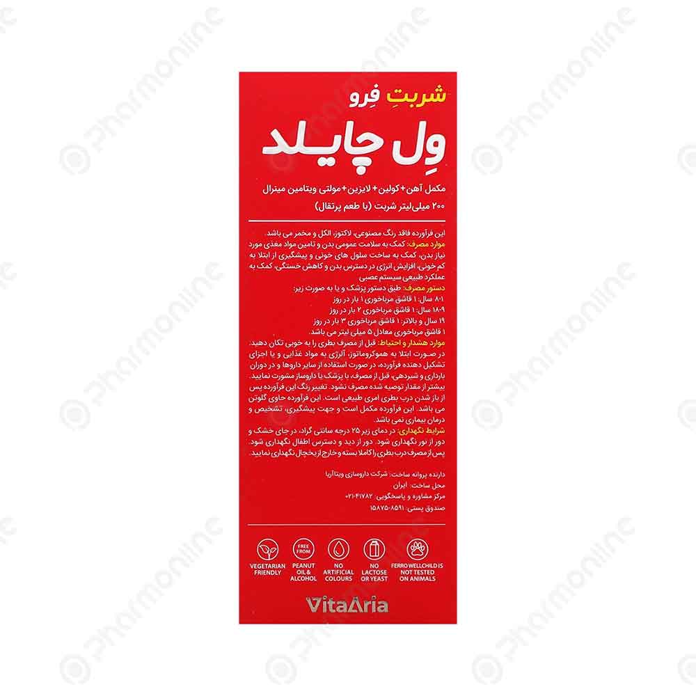 شربت فرو ول چایلد ویتاآریا حاوی آهن، کولین، لایزین و مولتی ویتامینهای مینرال میباشد. این محصول به تقویت سیستم ایمنی و بهبود رشد و تکامل کودکان نیز کمک میکند.